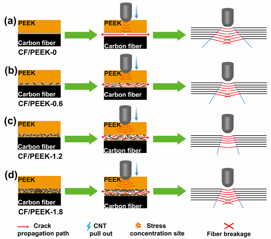 通过对CF/PEEK复合材料低速冲击行为进行研究,研究团队进一步揭示了梯度模量界面层重塑材料抗冲击行为的内在逻辑。在未添加CNTs时,薄弱的界面结合力导致裂纹在冲击载荷下几乎不受阻碍地快速扩展,引发严重的界面脱粘、分层及纤维断裂。而通过引入1.2 wt.% 的CNTs,材料内部成功构筑起关键的“梯度模量过渡界面层”,在应力传递中起到了核心缓冲作用。同时CNTs的引入可以迫使裂纹扩展路径变得更加曲折且漫长,显著提升了能量消散效率;结合CNTs从基体中拔出时的微观耗能过程,有效遏制了分层损伤的横向蔓延,从而将损伤限制在中心区域,以获得更高的冲击后压缩强度(见图5)。